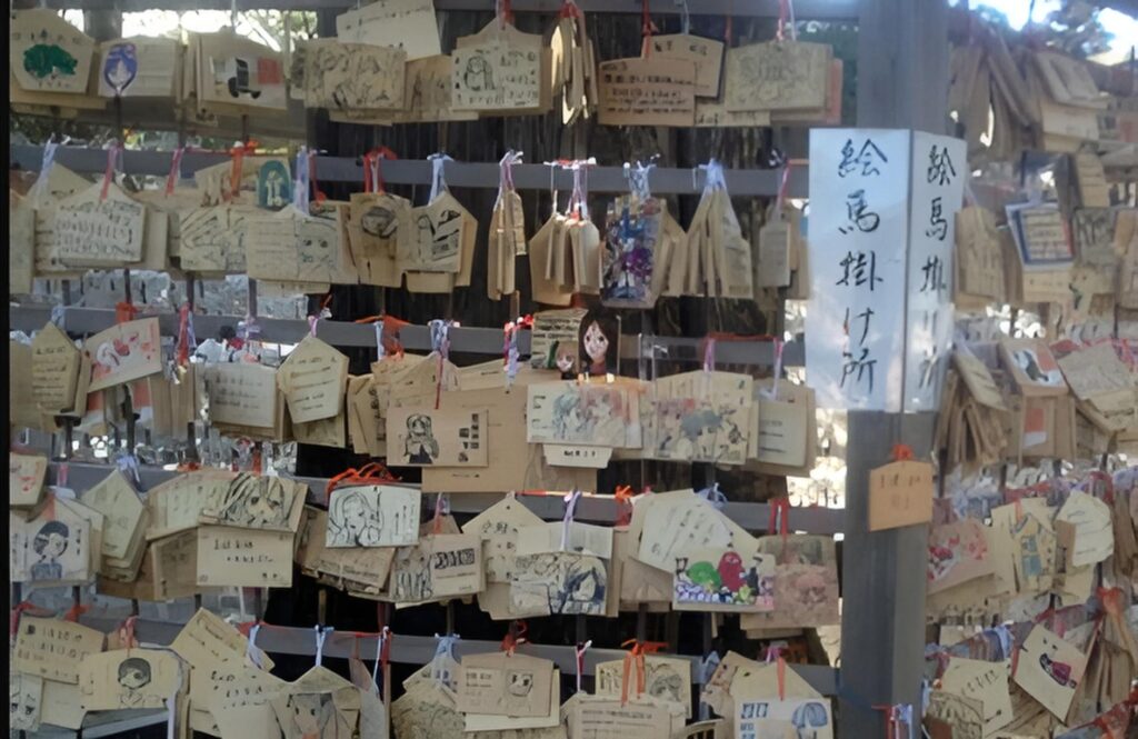 絵馬には願いを書いて奉納します。自分の好きなアニメの主人公を描いて吊るす人もいます
